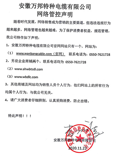 鄭重聲明:安徽萬邦特種電纜有限公司官方網站為:www.wanbangcable_com.haoweite.cn,除此之外無任何子網站或合作網站,其余均為假冒偽劣。電話:0550-7621728 13485756353 地 址:安徽省天長市滁州高新技術產業開發區經四路29號
